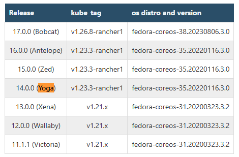 cluster_user_trust = TrueAlso I'm not 100% sure if this is still needed, nor if it is the right way to do, but this was mentioned in the official Magnum User Guide for an older OpenStack release. In the Yoga documentation it just mentions to set parameter "enable_cluster_user_trust: true" in globals.yml. I couldn't find this in my globals.yml file and so I just sticked with the older approach.
